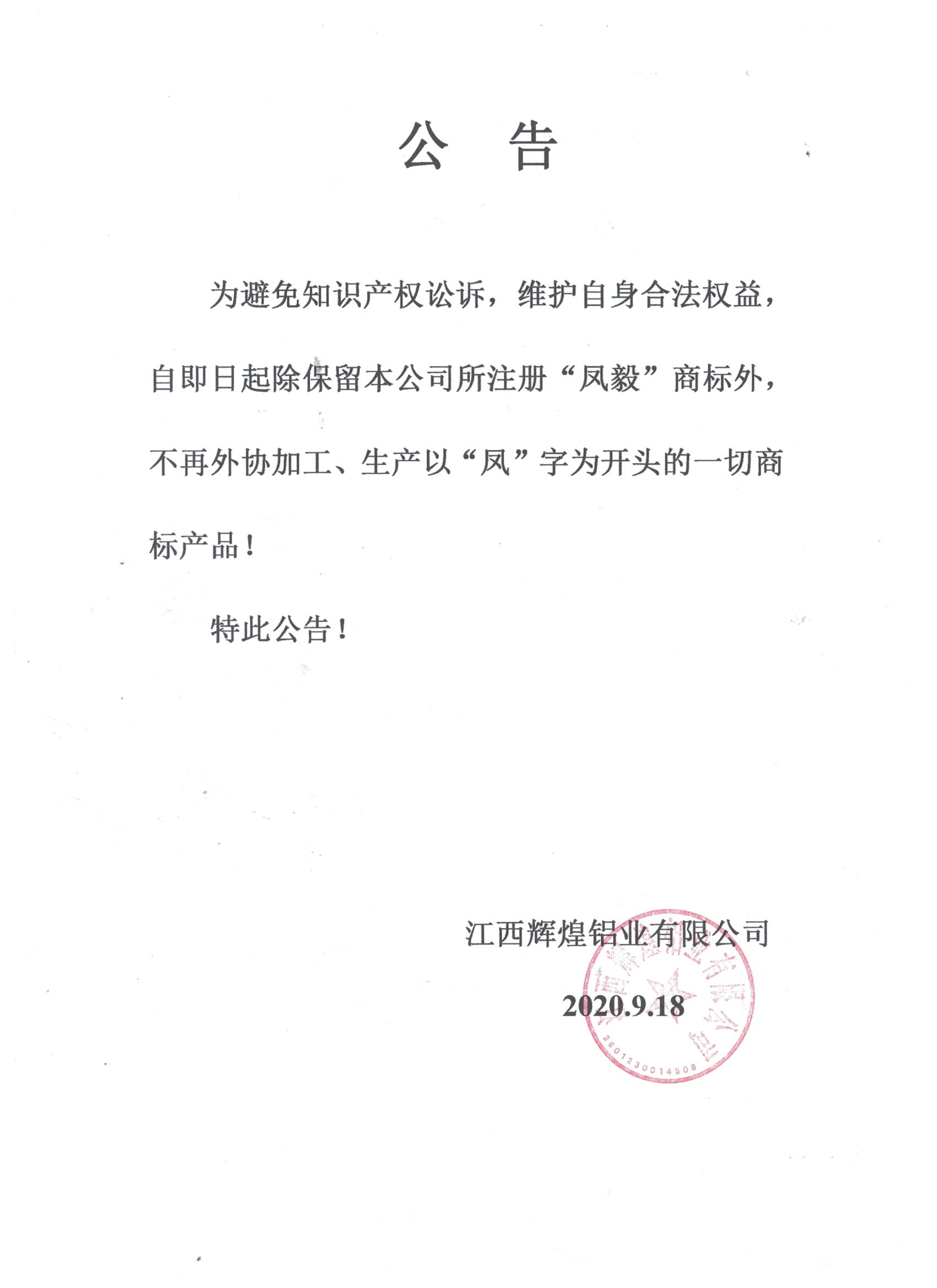 為避免知識(shí)產(chǎn)權(quán)訟訴,維護(hù)自身合法權(quán)益,自即日起除保留本公司所注冊(cè)“鳳毅”商標(biāo)外,不再外協(xié)加工、生產(chǎn)以...